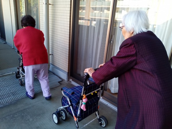 師走に入り、本格的に寒くなってまいりました!グループホームみんなの家・西東京はとても日当たりが良いので、日中は暖かいのが特長です♪天気の良い午後の日、皆様をベランダの散歩にお連れしました。厚着しないと寒いのではと危惧していましたが、窓を開けて歩いてみたらとても暖かかく散歩日和でした♪ベランダを一周して、ベンチに腰掛けて休憩したのですが日差しが強く「まぶしいねー」と皆様話されてました。気分転換の後はジュースを召し上がりました♪