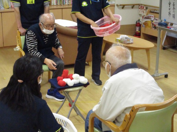 こんにちは、デイサービスセンター遊・西東京です。今日の運動レクレーションは『お手玉ツムツム』です!