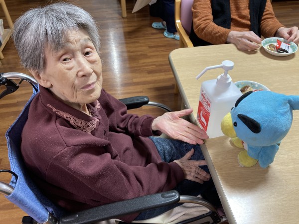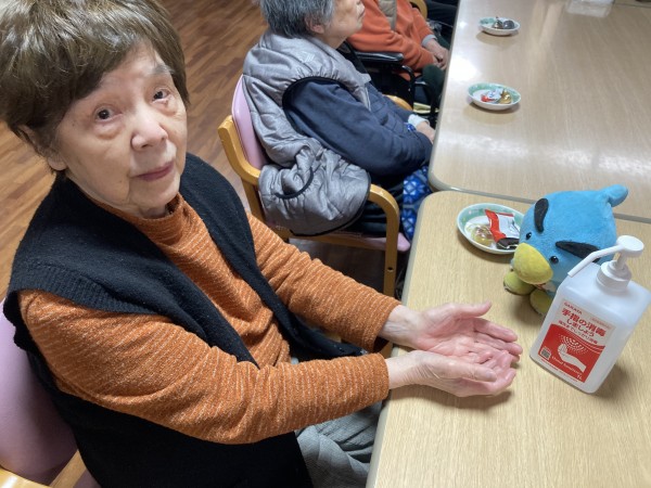 今回は食事前(七草粥)にスタッフさんのお手伝いとしてご利用者様に手の消毒しています。
