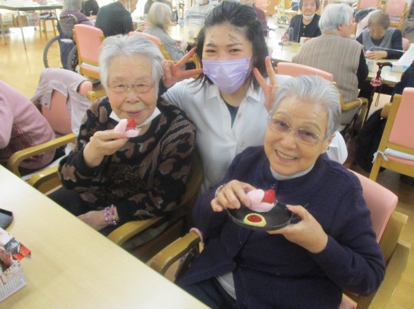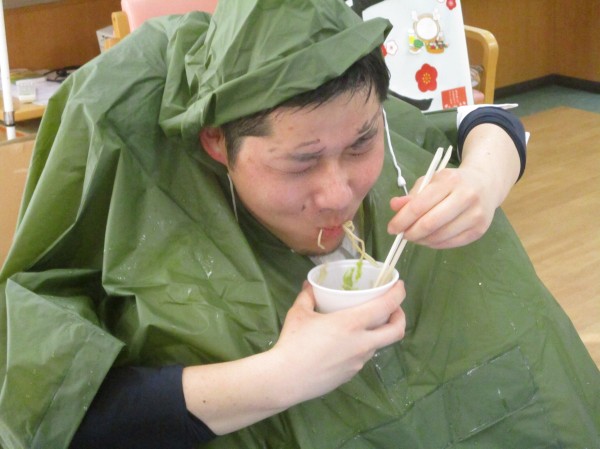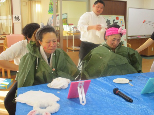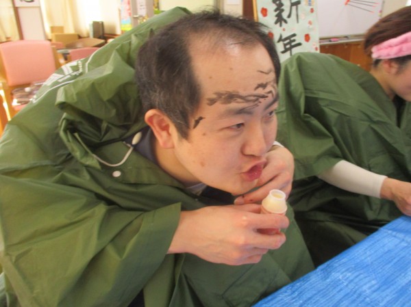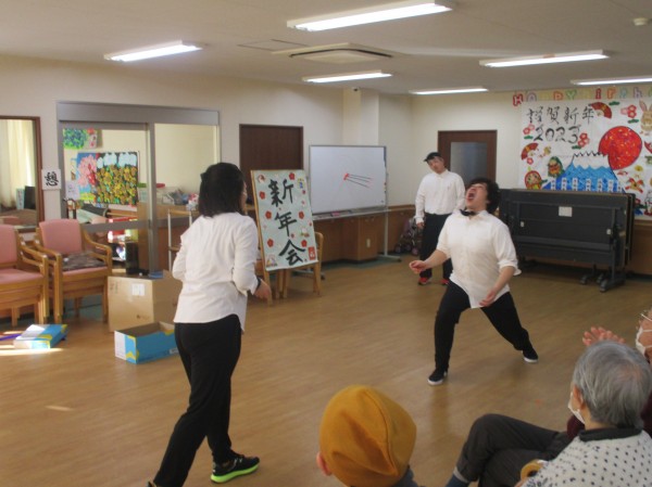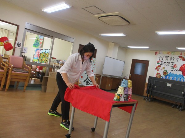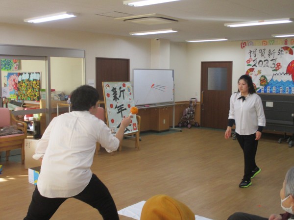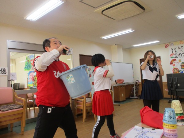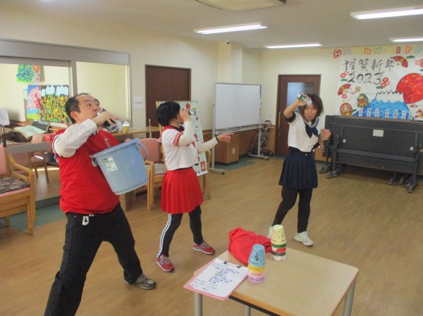水が入っていると思われるバケツの中が実は紙吹雪と変わっており、ご利用者様めがけて投げた時は驚きと面白さで拍手喝采でした(*^^)v