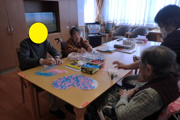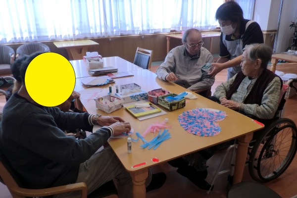 女性の利用者様が他の方にレクチャーしながら作品作りをされております。