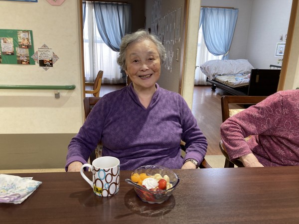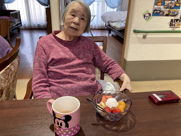 豆まきの後、スタッフ手作りのプリンアラモードと青森産りんご100%のりんごジュースをお召し上がりになりました