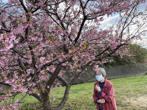 受診の帰りにホーム付近に咲いている、満開の河津桜に寄り道。