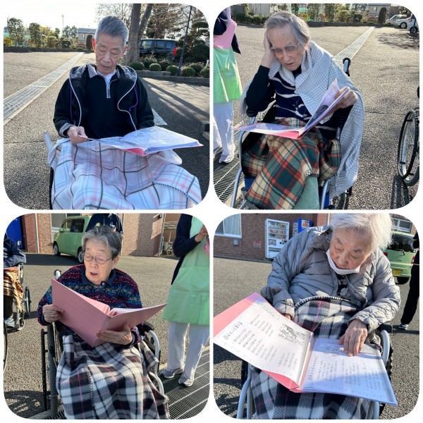 今年は暖かい日が多くいつもより外に出る機会があるように思います。当施設は駐車場が広いので外気浴には最適!!先日も暖かな陽射しに誘われて皆さんと一緒に『青空』の下外気浴を兼ねて合唱をしました。