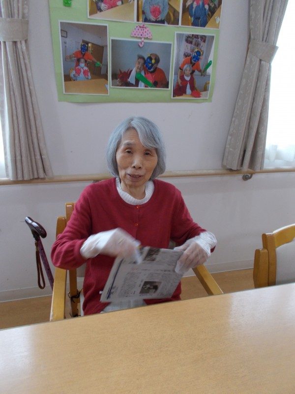 古新聞を再利用するために1枚づつ折りたたんでいます。