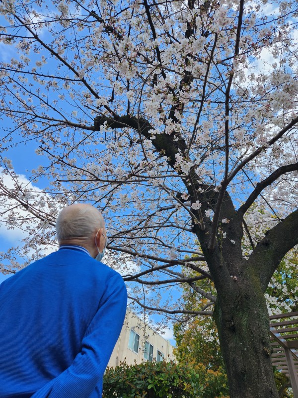 風になびく桜の花びらがちょうど入居者様の頭の上に落ちてきて、髪飾りのようにつけて写真を撮ってみました☆