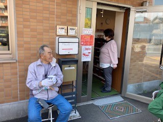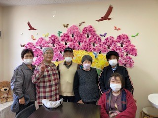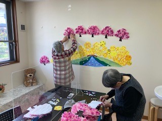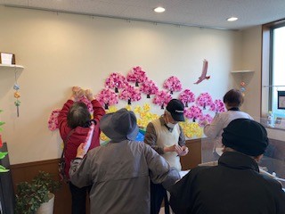 2023.4.3 せせらぎ前ラジオ体操後、残って頂いた皆さんに サロン井戸端会議&壁面装飾にご参加頂きました。