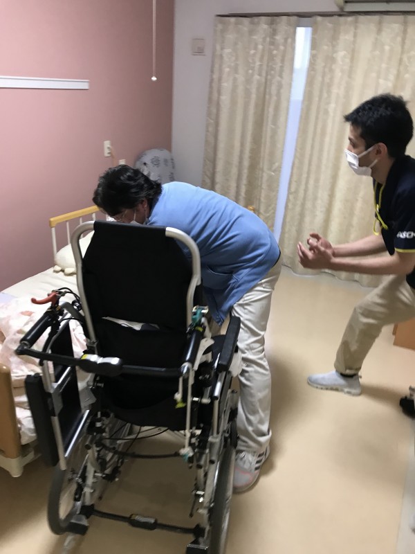 今回は「車いす→ベッド」「ベッド→車いす」への移乗の講習会です。