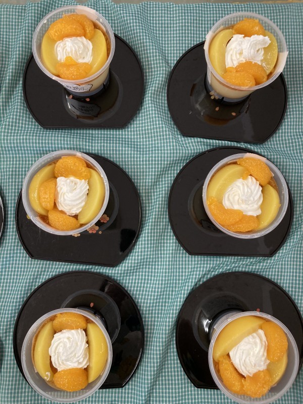 プリンに桃とみかん、ホイップクリームのトッピングでしょうか?豪華ですね♪