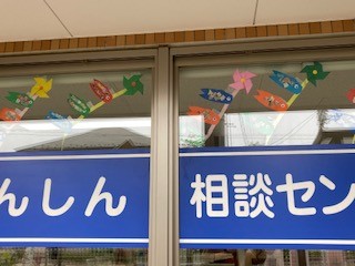前週の四季彩おりがみ教室で制作頂いた小さめの鯉のぼりをうろこに見立て、大きな鯉のぼりがせせらぎの壁に舞い上がりました。