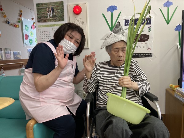 5月も変わらず、元気いっぱいの皆様をご紹介していきます。5月5日は子どもの日。しょうぶを持っての1枚です。しょうぶ湯に入りました~!!!