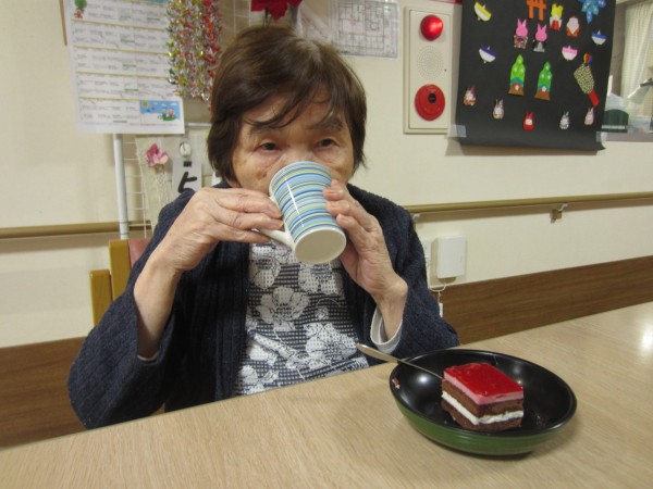 おやつのお時間にさくらんぼのケーキを召し上がりました。皆様が「甘酸っぱくて美味しいね。これ大好きなんだよ。」と美味しそうに召し上がっておりました。