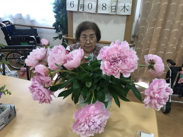 シャクヤクの花がホームに届き、蕾だった花も翌日には満開になりました♪大ぶりなお花に皆様「すごいわね~」「綺麗ね~」と感嘆の声を上げられました!香りも良かったですね!お花とのショットで素敵な表情が撮れました♪