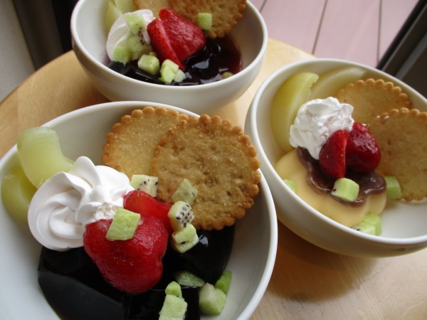 3種類のバリエーションでプリンアラモード・コーヒーゼリーアラモード・ぶどうゼリーアラモードを選んで頂きました。