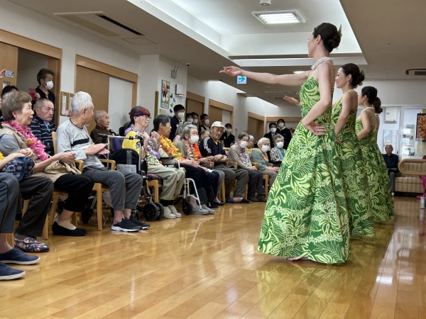 曲に合わせて手拍子をする方、手を動かして一緒に踊る方、涙ぐまれる方、可愛いフラガールに目を細め笑顔になられる方。はたまた素敵なフラガールに釘付けになる男性利用者様(笑)とても楽しい時間となりました。
