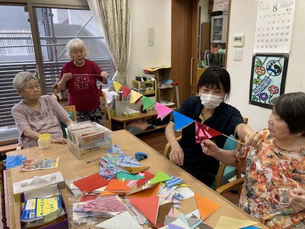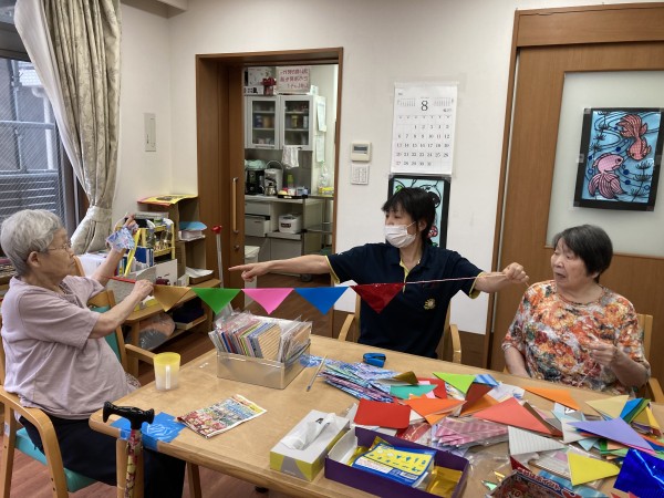 パーティーフラッグ作りです。入居者様との共同作業!