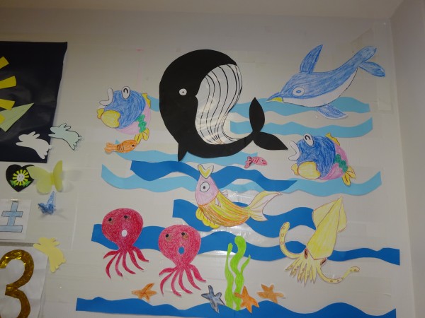 8月の壁飾りも涼しそうな「海の仲間たち」です。