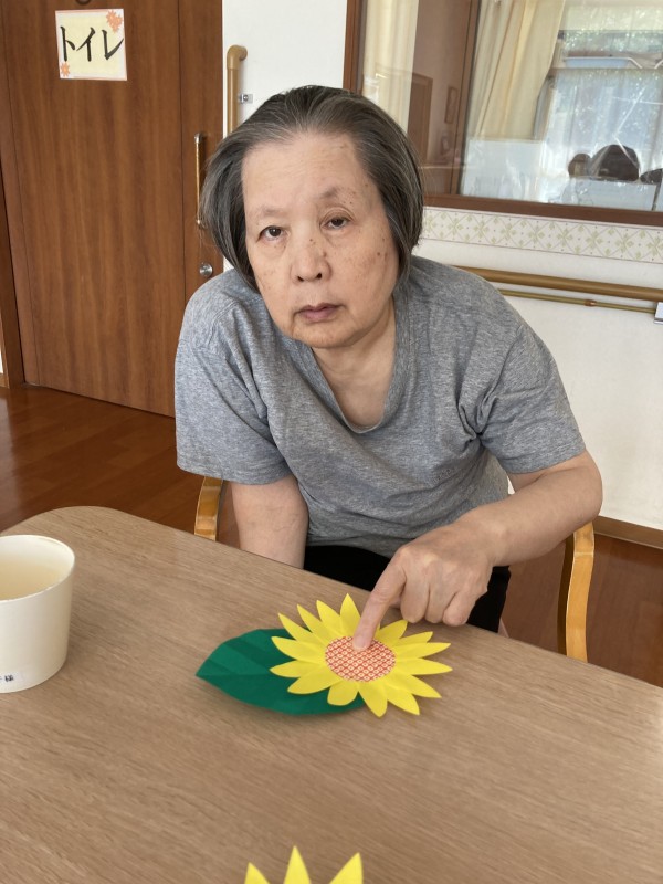 折り紙で作った「ひまわり」を葉っぱに貼り付けをし、レイアウトを考えながら利用者様が「ここでいいの?」「こっち?」など