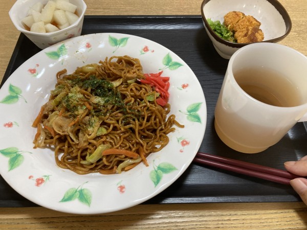 献立は、ソース焼きそば、カレーコロッケ、梨とピーチティゼリーです。
