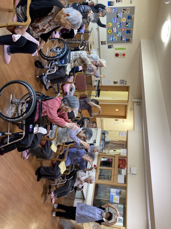体操は食事の前に口腔体操など日々行っておりますが、大人数での体操は日々の体操とは違って力が入るのでしょうか…皆様真剣に楽しそうに行われていました。