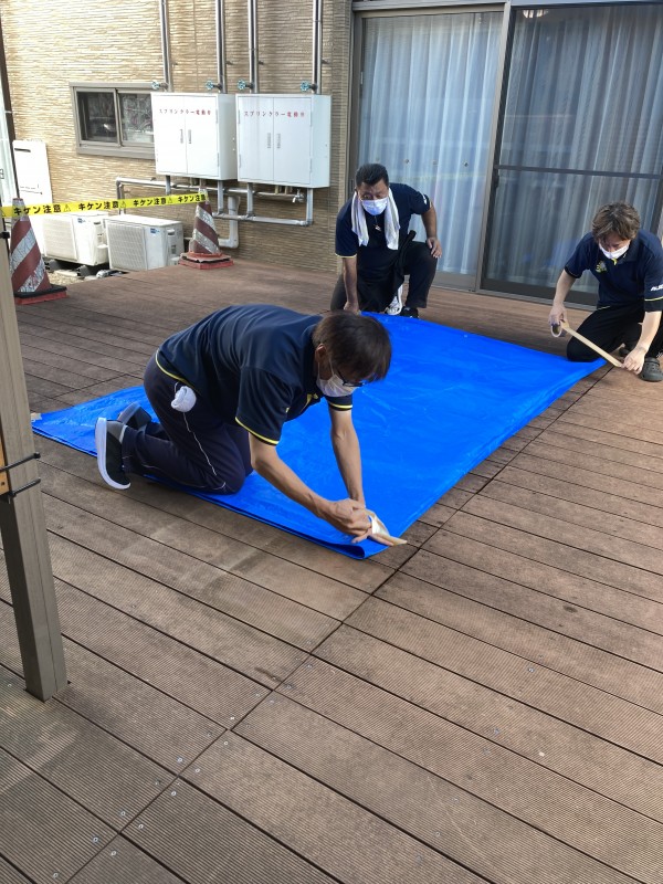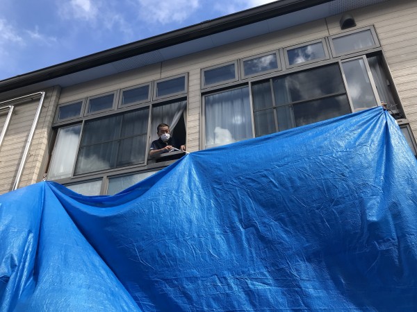日除け用シート張り‼当日は風が強くなってきて男性スタッフ総出による作業‼