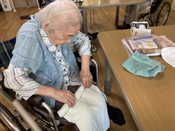 タオルをせっせと巻いては棒のようにして、広げてはまた畳んだり