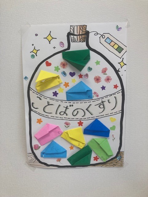 ことばが書けた人から、職員お手製「ことばのくすり瓶」に貼っていきます