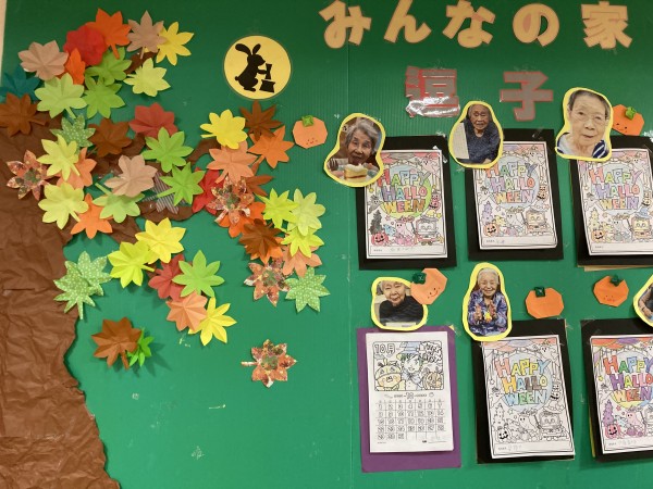職員と一緒に折り紙をおり、皆さんに広げてもらい、