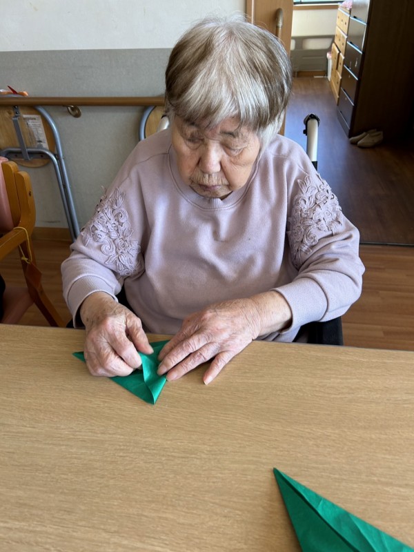 フロアの飾り付けをご利用者様と一緒に折り紙を使ってリースを作成しています♪