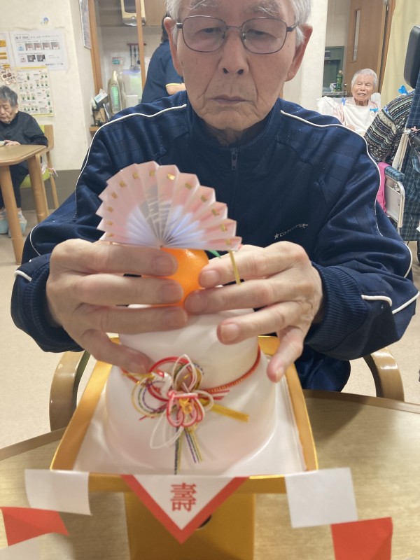 鏡餅のお飾りをして頂きました。皆さまで順番にみかんをのっけて完成させて飾らせて頂きました。