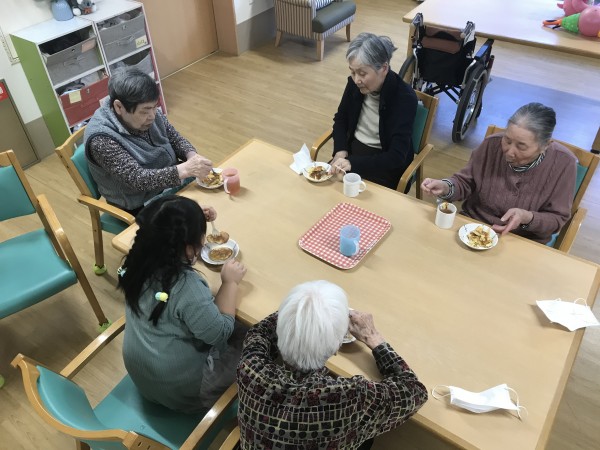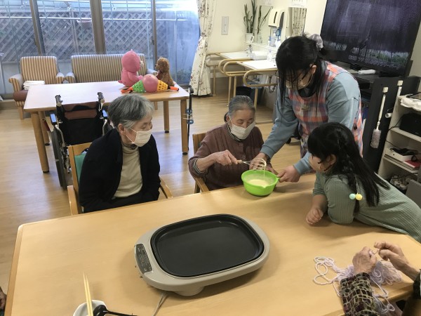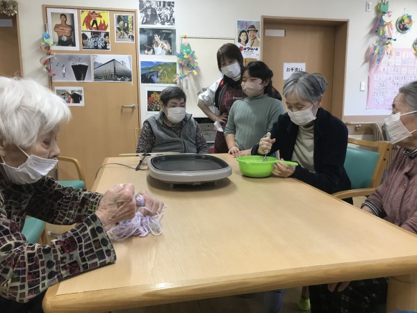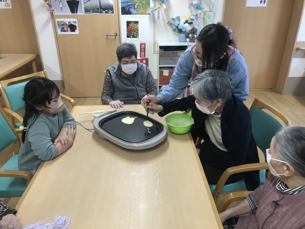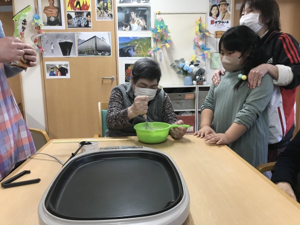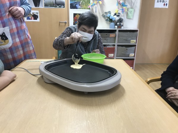 へらでひっくり返す時には、焼きがあまくて形が崩れてしまう事も有りましたが、職員も一緒に行い