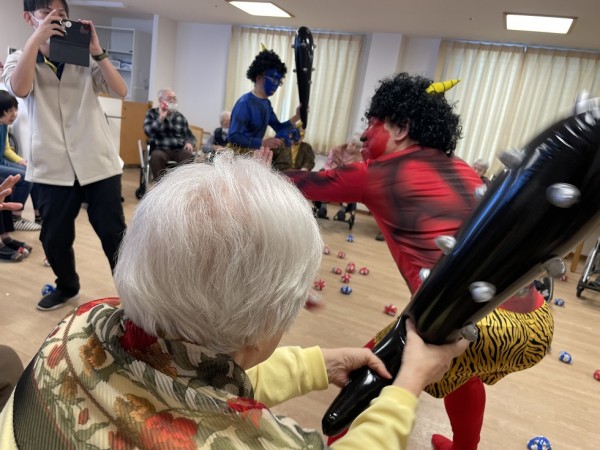 鬼にめがけて、お手製の新聞紙ボールを思いっきり!