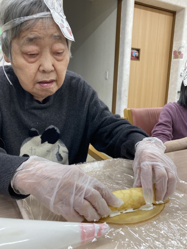 クレープ生地とフルーツ、ホイップクリームを使って、恵方ロールを作りました。皆さん器用にくるくると巻いています。