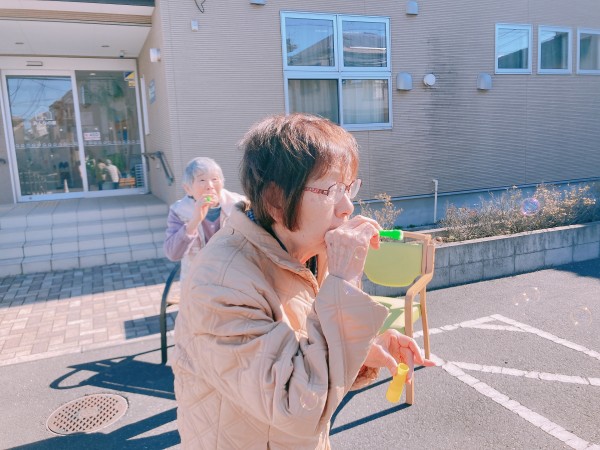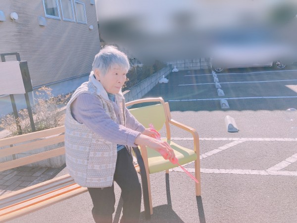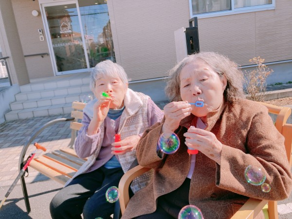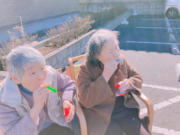 職員の方に風が向いたときは職員がシャボン玉を体いっぱいに浴びました(´▽`)