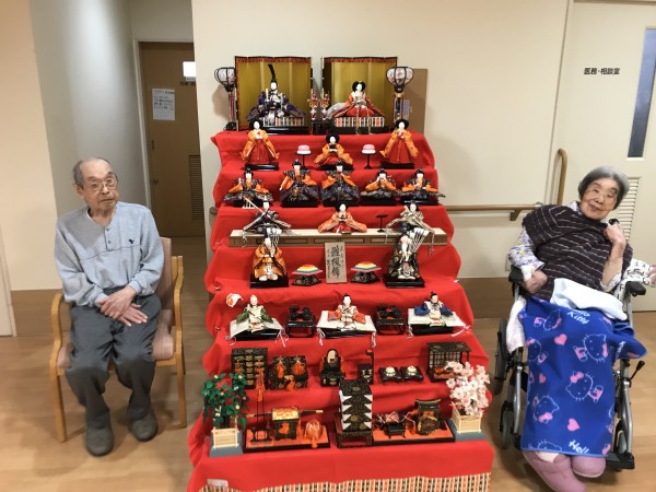 ひなまつり当日にひな壇の横で記念撮影をしました!皆様なんだかいつもより姿勢がとても良い気がします!2つのひな壇をじっくりと鑑賞して満足そうにされる方も居ました!