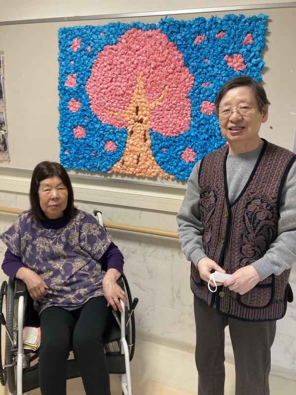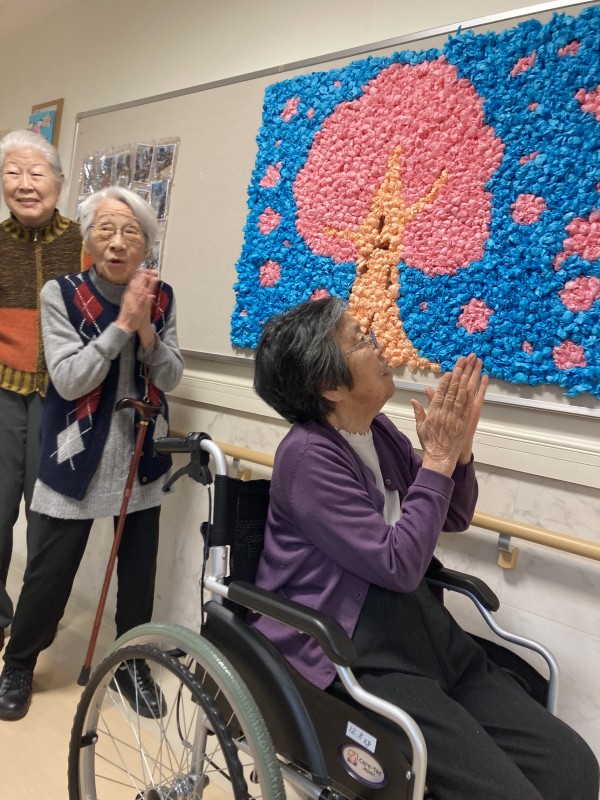 桜の壁画が完成しましたので、さっそく一階に飾りましたよ!