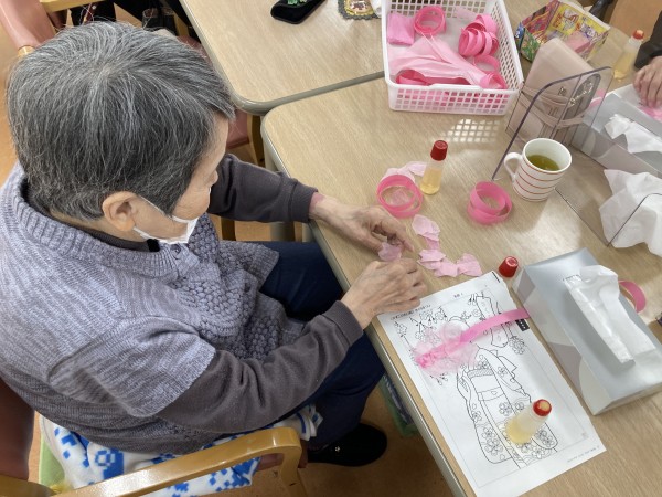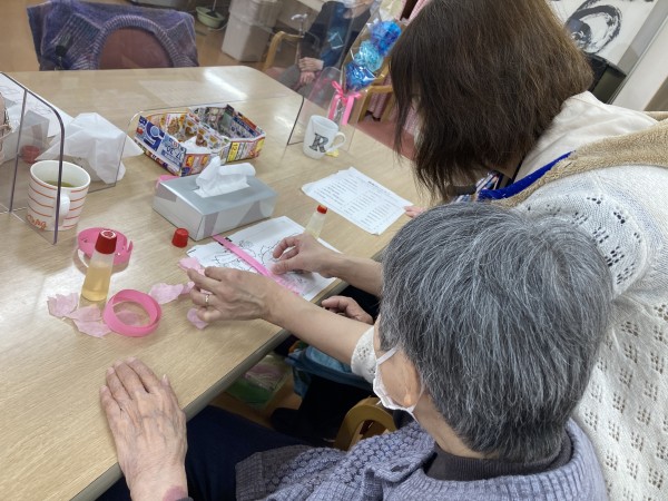 貼り方をスタッフに教わりながら花びらを貼っていきます