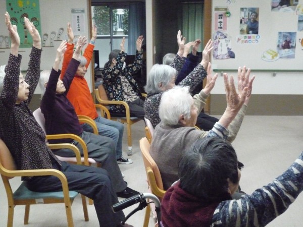 1Fに集まって、テレビ画面越しにヨガの先生と挨拶。