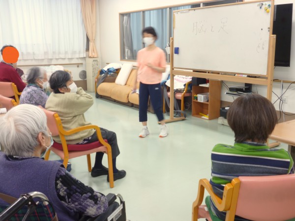 イスを支えに両足上げや手と共に同じ手を動かしたり逆の手を動かしたりと