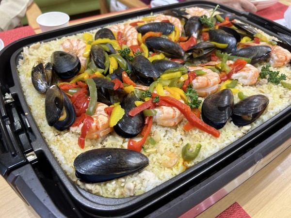 シーフードのいい香りにフロアー内が包まれて、皆口々に「早く食べたいね〜」と!彩の綺麗な海鮮パエリアが完成して、フタを開けると皆さん歓声をあげていました‼️
