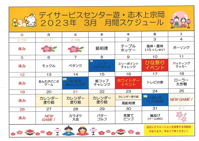 ☆2023年3月★月間レクリエーションカレンダー☆
