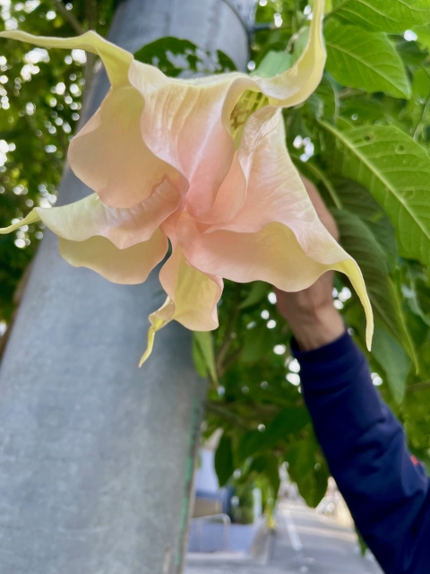 ご利用者様と買い物の道中「エンジェルトランペット」を発見